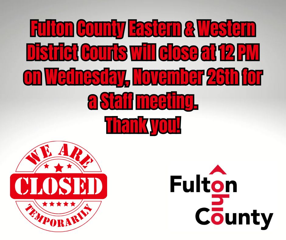 The Fulton County Eastern & Western District courts will be closed at 12 PM on Wednesday, November 26, 2025 for an office staff meeting. Thank you!