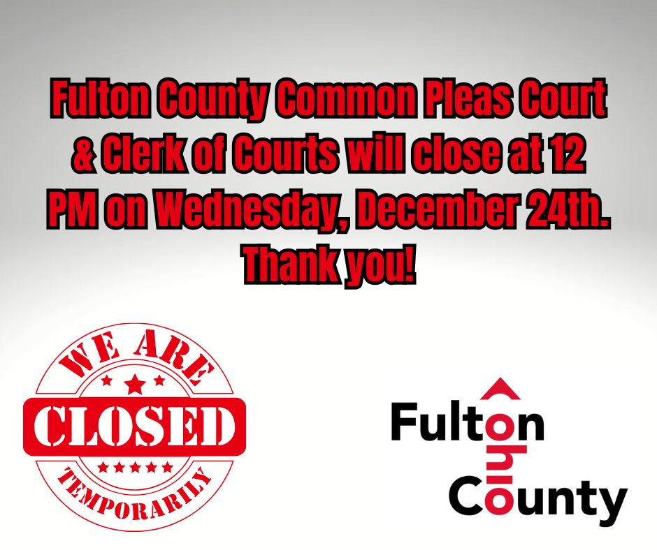 The Fulton County Common Pleas Court & Clerk of Courts will close at 12 PM on Wednesday, December 24, 2025 in observance of Christmas Eve. Thank you!
